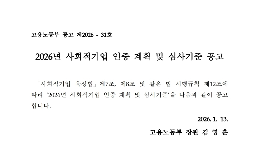 고용노동부 2026년 사회적기업 인증계획 및 심사기준에 따라 2026년 사회적기업 인증 2차 신청 안내가 한국사회적기업진흥원 홈페이지에 공고되었습니다!