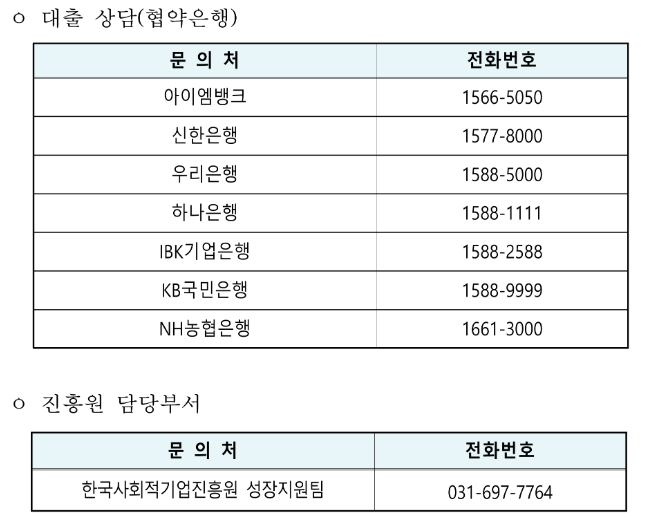 ◆ 지원 대상 : (예비) 사회적기업 (*지원제외 대상 : 신청일 현재 휴·폐업 중인 기업, 신청일 현재 협약은행의 한도액까지 대출받아 상환 미완료 기업, 대표자(실제 경영자 등) 관련 금융권 채무가 연체 중인기업, 법령위반 등으로 사회적 물의를 일으킨 기업)