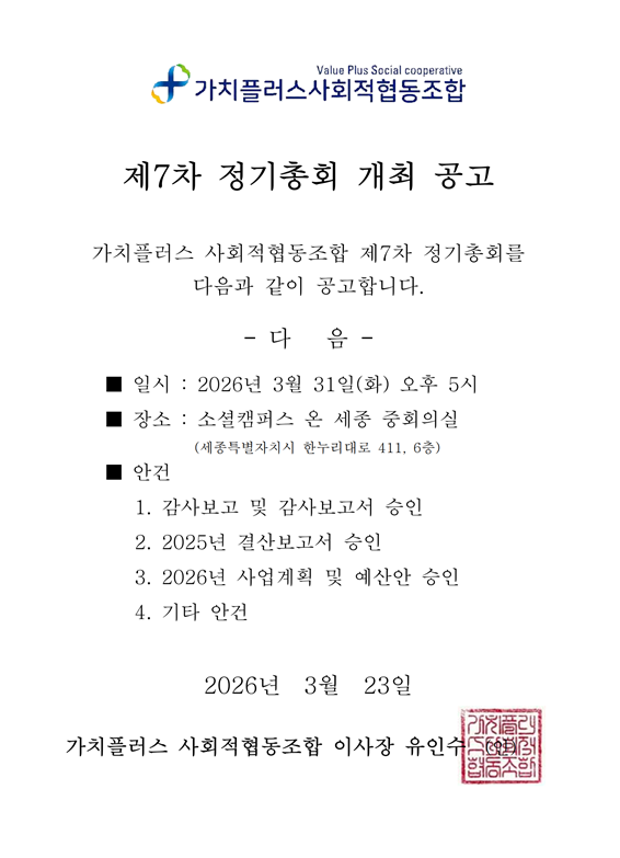 가치플러스 사회적협동조합 제7차 정기총회를 아래와 같이 공고합니다.
