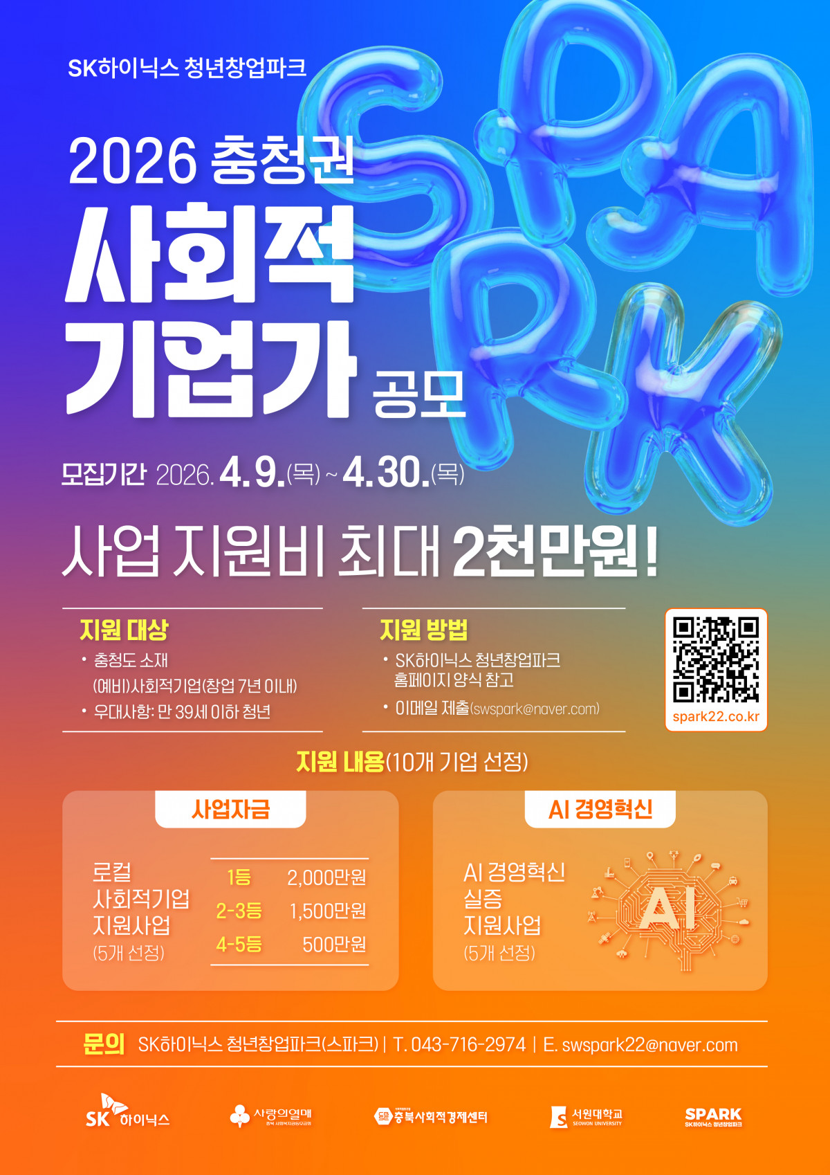 서원대학교 SK하이닉스 청년창업파크(스파크)에서 2026년 충청권 사회적기업가 공모를 진행합니다.