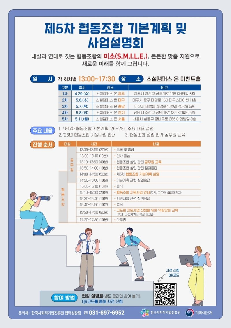 한국사회적기업진흥원 협력성장팀에서 제5차 협동조합 기본계획 및 사업설명회를 진행합니다.