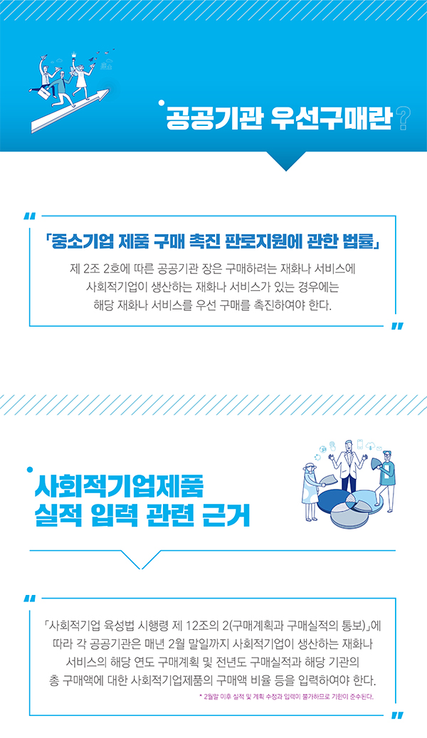 「사회적기업 육성법 시행령 제 12조의 2(구매계획과 구매실적의 통보)」에 따라 각 공공기관은 매년 2월 말일까지 사회적기업이 생산하는 재화나 서비스의 해당 연도 구매계획 및 전(前)년도 구매실적과 해당 기관의 총 구매액에 대한 사회적기업제품의 구매액 비율 등을 입력하여야 한다.